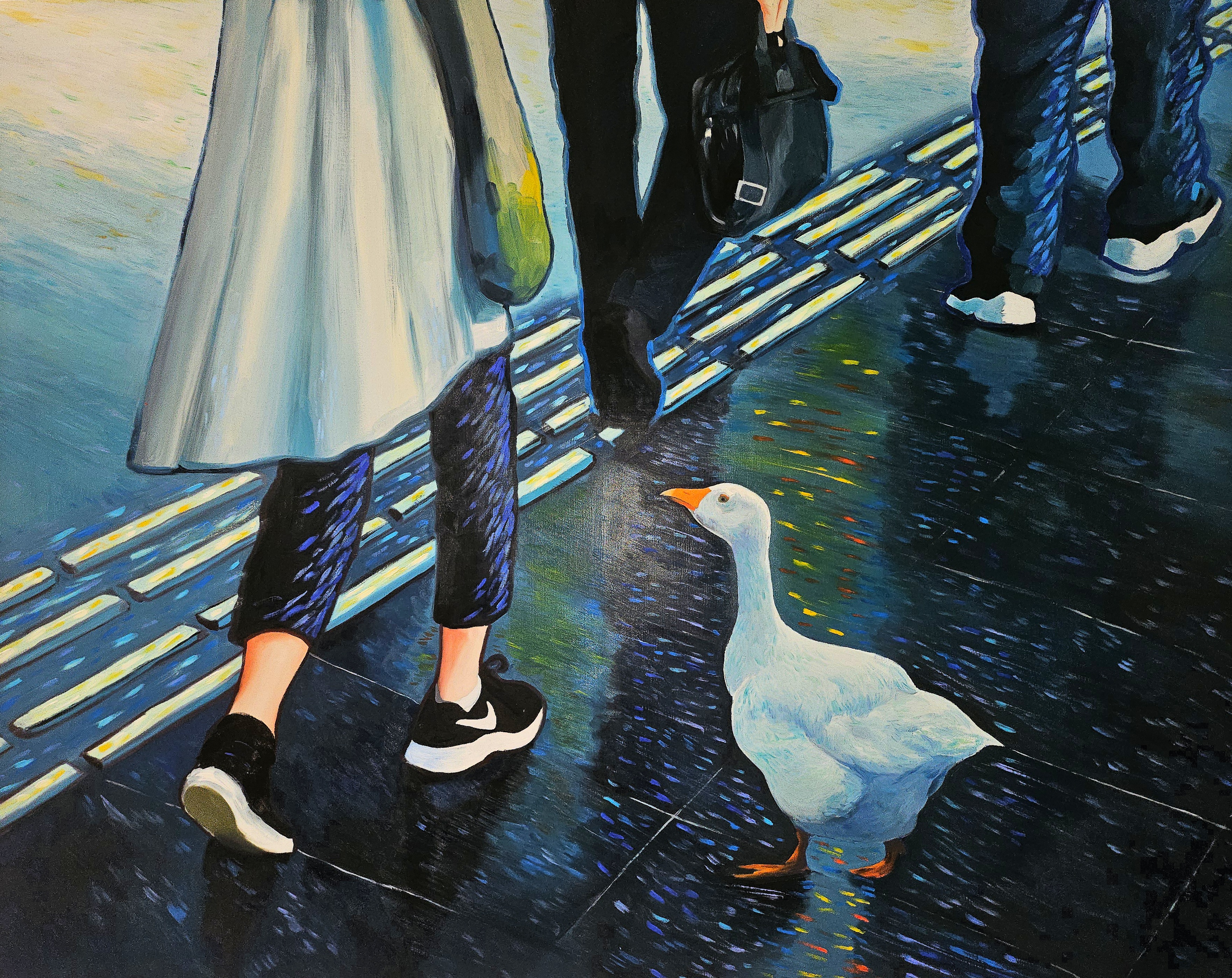 | 작품설명 | 이 작품은 바쁜 현대를 배경으로, 목적지를 향해 서둘러 가는 사람과 반대로 뒤뚱거리며 목적지가 아닌 사람을 따라가려 애쓰는 거위의 모습을 표현하였다. 등장하는 인물들은 가족, 주변 사람을 상징한다. 3남매의 둘째라는 위치가 다른 형제들에 비해 우선순위가 밀리더라도 어쩔 수 없는 현실이며, 바뀔 수 없는 현실이라는 것을 알기에 저를 두고 목적지를 향하는 사람들을 바라보고, 그 얼굴에는 그런 현실에 대한 슬픔과 체념이 드러난다. 소외감을 강조하기 위해 목적지를 향해 걸어가는 사람들의 모습에는 모두 외곽선이 그려져 있지만 거위에겐 그려져 있지 않은 것이 특징이다. 또한, 불안한 심리를 강조하기 위해 다양한 색을 여기저기에 서로 다른 방향의 붓 터치로 표현하였다. 방향을 알려주는 점자블록과 걸어가는 사람들의 붓 터치는 우측 상단을 향하지만, 거위와 바닥의 붓 터치는 우측 하단을 향한다. 이렇게 서로 다른 방향의 거친 붓 터치는 비참함과 불안감을 극대화하는 효과를 준다. |