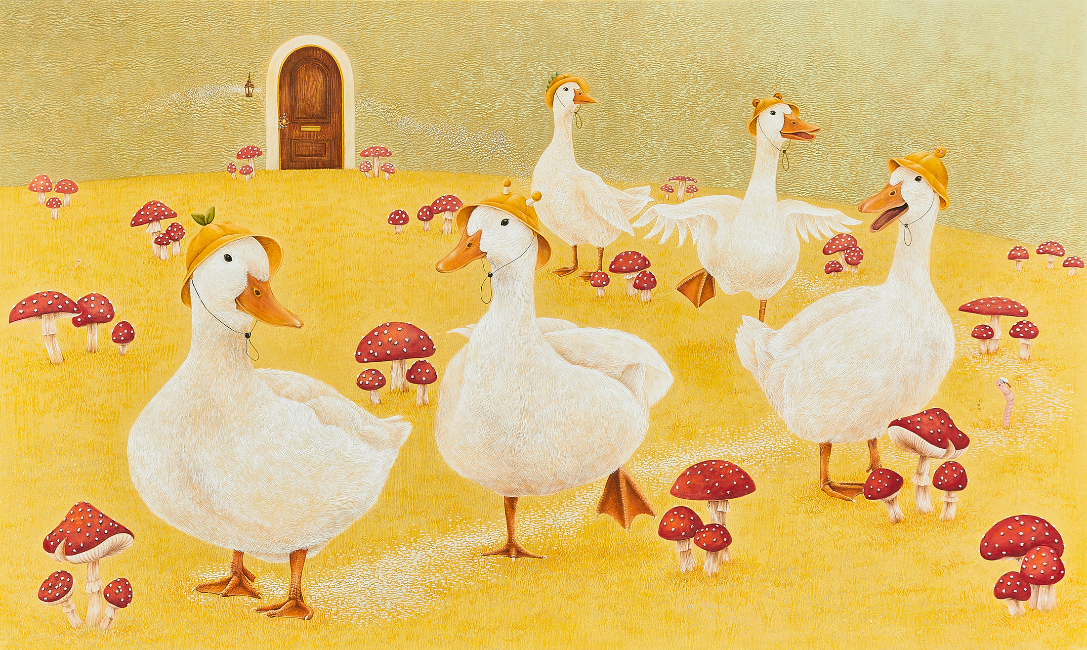 버섯은 서양에서 행운과 마법, 동양에서는 건강과 풍요를 상징한다. 그 붉은 형상은 한때의 기억과 겹쳐지며, 화면 안에 다층적인 의미를 머금는다. 전경에 놓인 큰 오리는 그 시절의 나이며, 배경의 작은 오리는 멀어져간 시간이자 아직 남아 있는 바람이다.