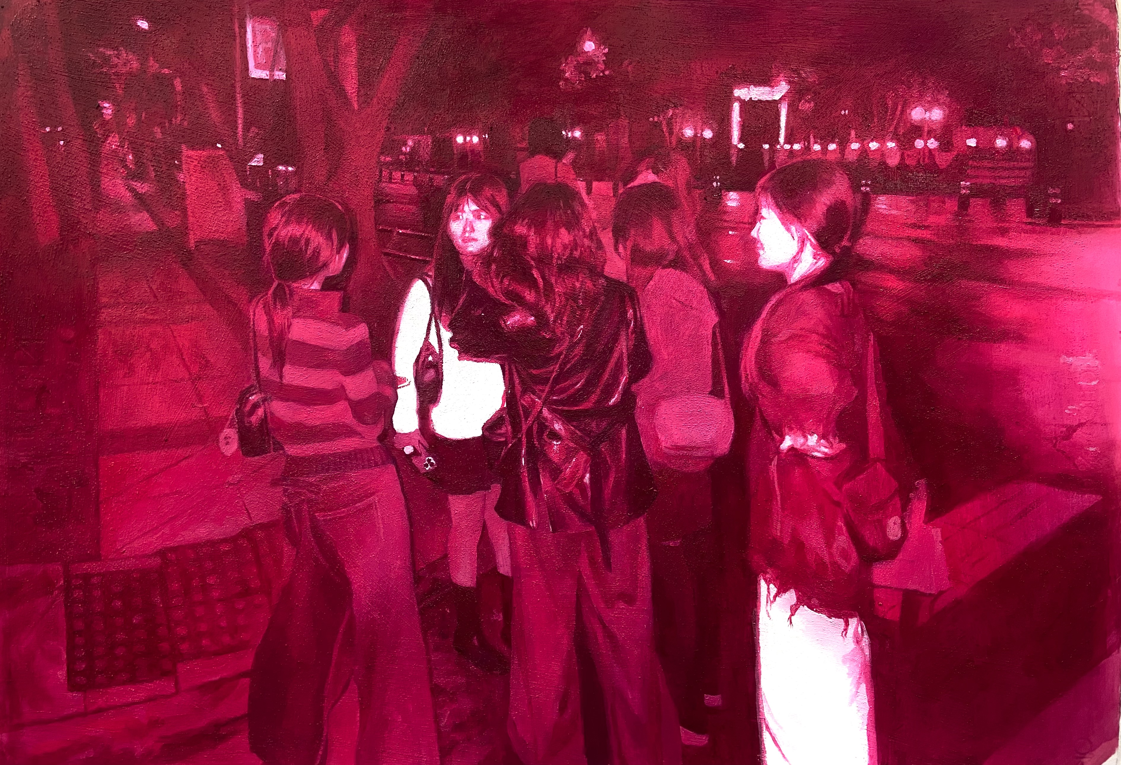 | 작품설명 | 거리에서 친구들과 나눈 한 순간을 단색의 필터로 재해석한 작업이다. 짙은 붉은 톤은 장면 전체에 감정적 농도를 입히며, 기억 속 장면처럼 선명하면서도 왜곡된 감각을 불러일으킨다. 인물들은 한데 모여 있지만 각자의 방향을 바라보며 시선을 교차하고, 그 거리감은 친밀함과 고립감을 동시에 드러낸다. 불빛이 흐릿하게 번지는 배경은 기억의 경계를 상징하며, 관람자에게도 그 순간에 함께 있었던 듯한 감정의 잔영을 남긴다. |
