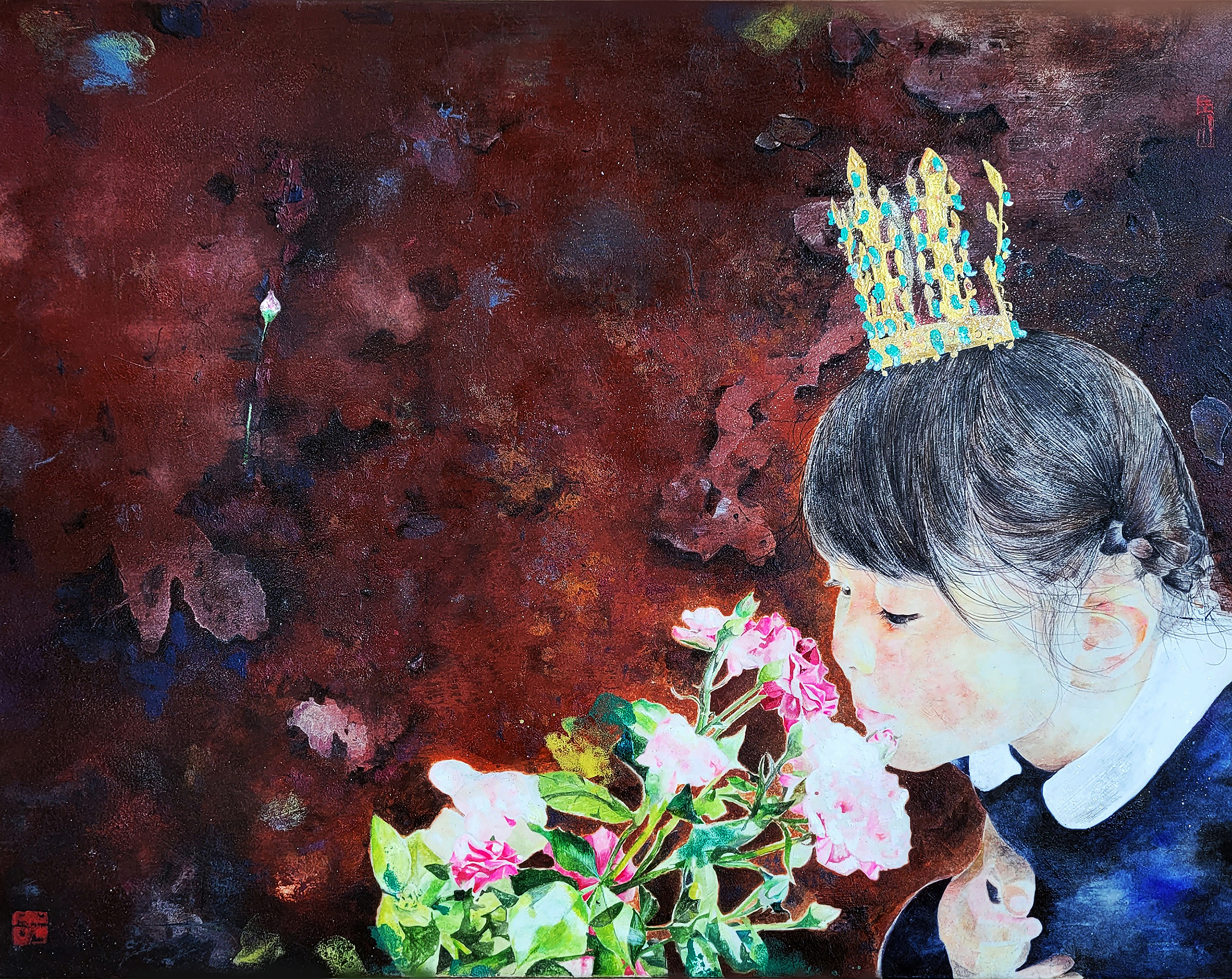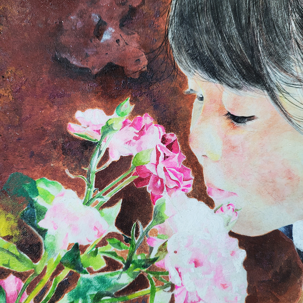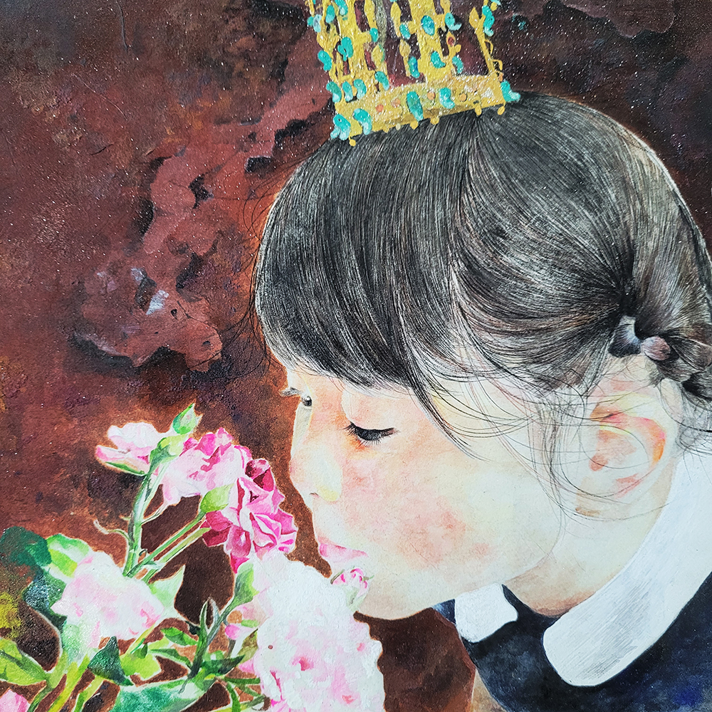 | 작품설명 | 작품은 한 소녀가 꽃을 가까이 마주한 채 순수한 숨결을 불어넣는 장면을 중심으로 구성됩니다. 아이의 머리위에는 문화유산인 금관을 놓여있으며, 그 상징성은 곧 존재의 고귀함과 생명에 대한 경외를 담고 있습니다. 깊은 갈색의 배경은 오랜시간 반복저으로 색을 쌓고 지우며 만들어낸 나만의고유한 질감이자 시간의 층위를 상징합니다. 이 배경 위에서 아이는 생명과 마주하고 마치 모든 감각을 통해 그것을 들이마시고 기억하는 듯한 모습로 그려졌습니다. |