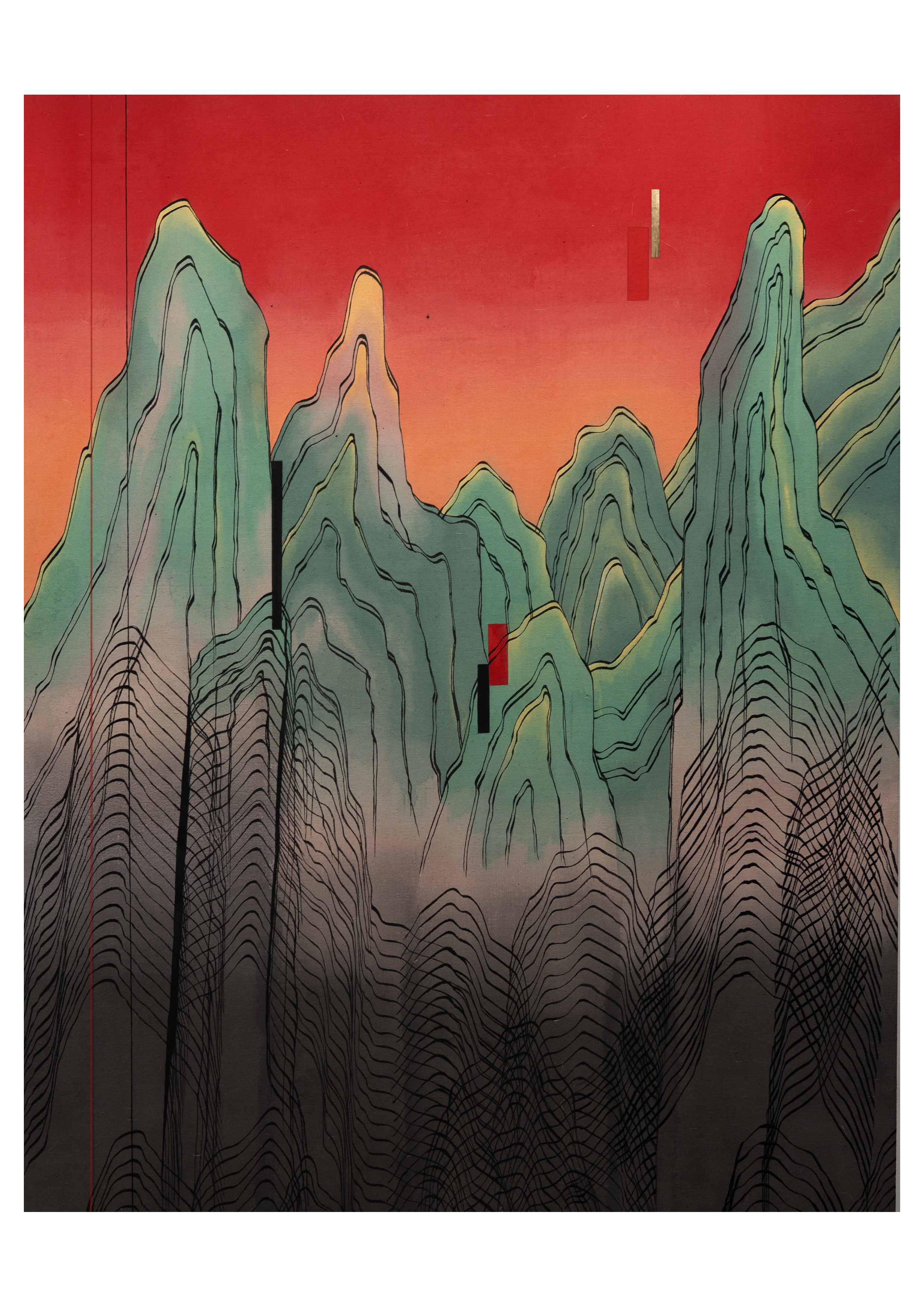 이 작품은 전통 산수화의 형식을 차용하되, 강렬한 붉은 색과 깊은 검은선의 흐름과 겹침, 그리고 글리치적 왜곡과 균열을 통해 고요한 산수 속에 내면의 불안과 긴장을 담아냈다.