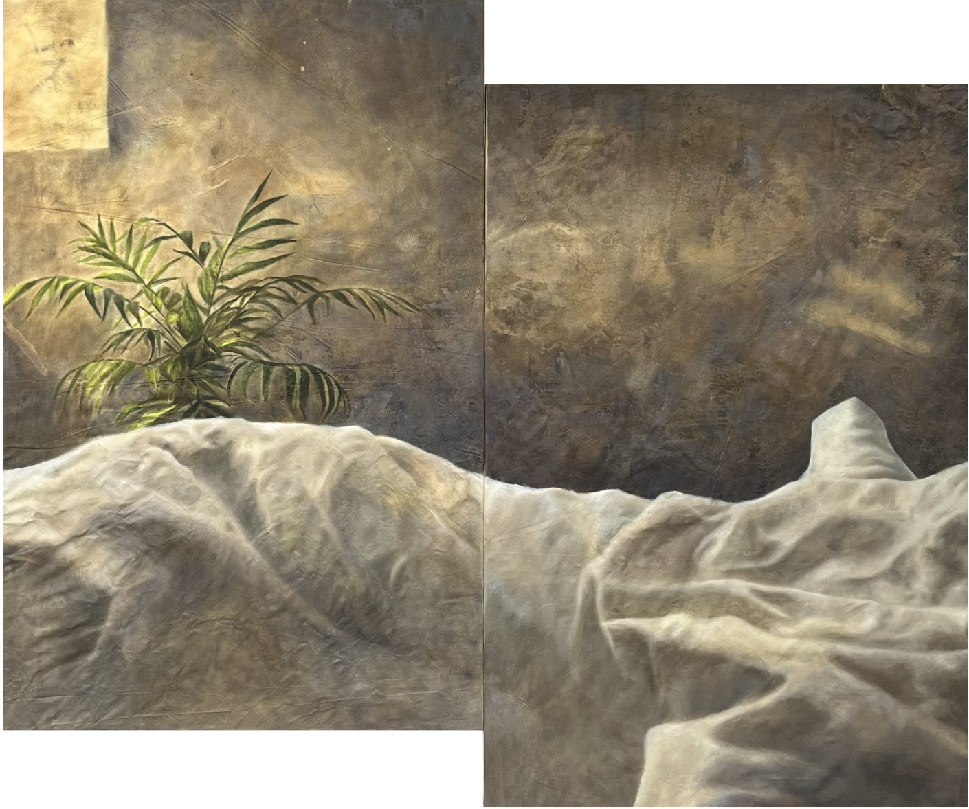 유실된 것들과 지나간 것들의 흔적을 아교로 포착해 레이어를 만들어내고, 그 위에 항상 곁에 있어주는 것들을 새겨넣습니다. 이를테면 방 한켠에 매일 있는 이름 모를 식물, 이불과 조명처럼