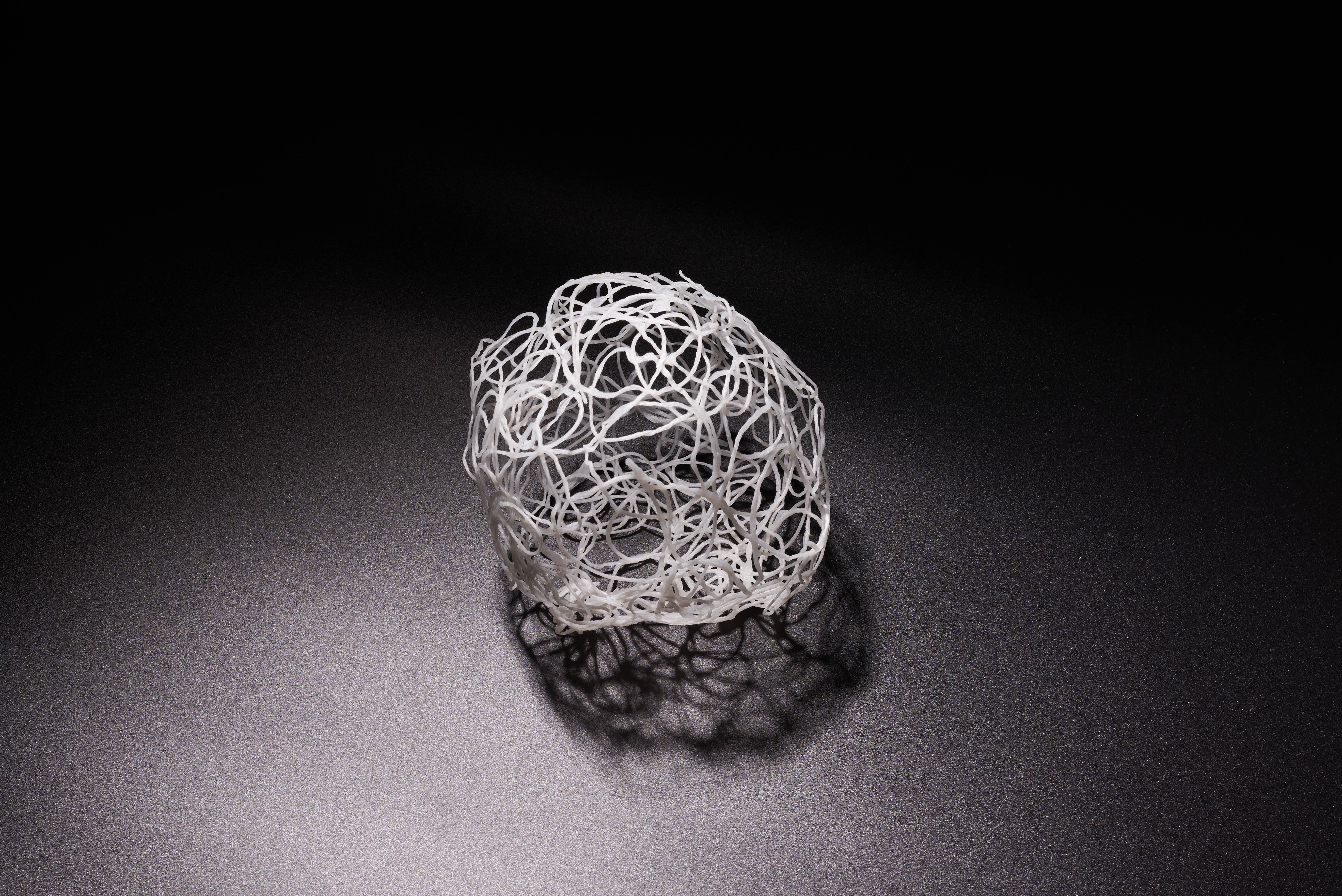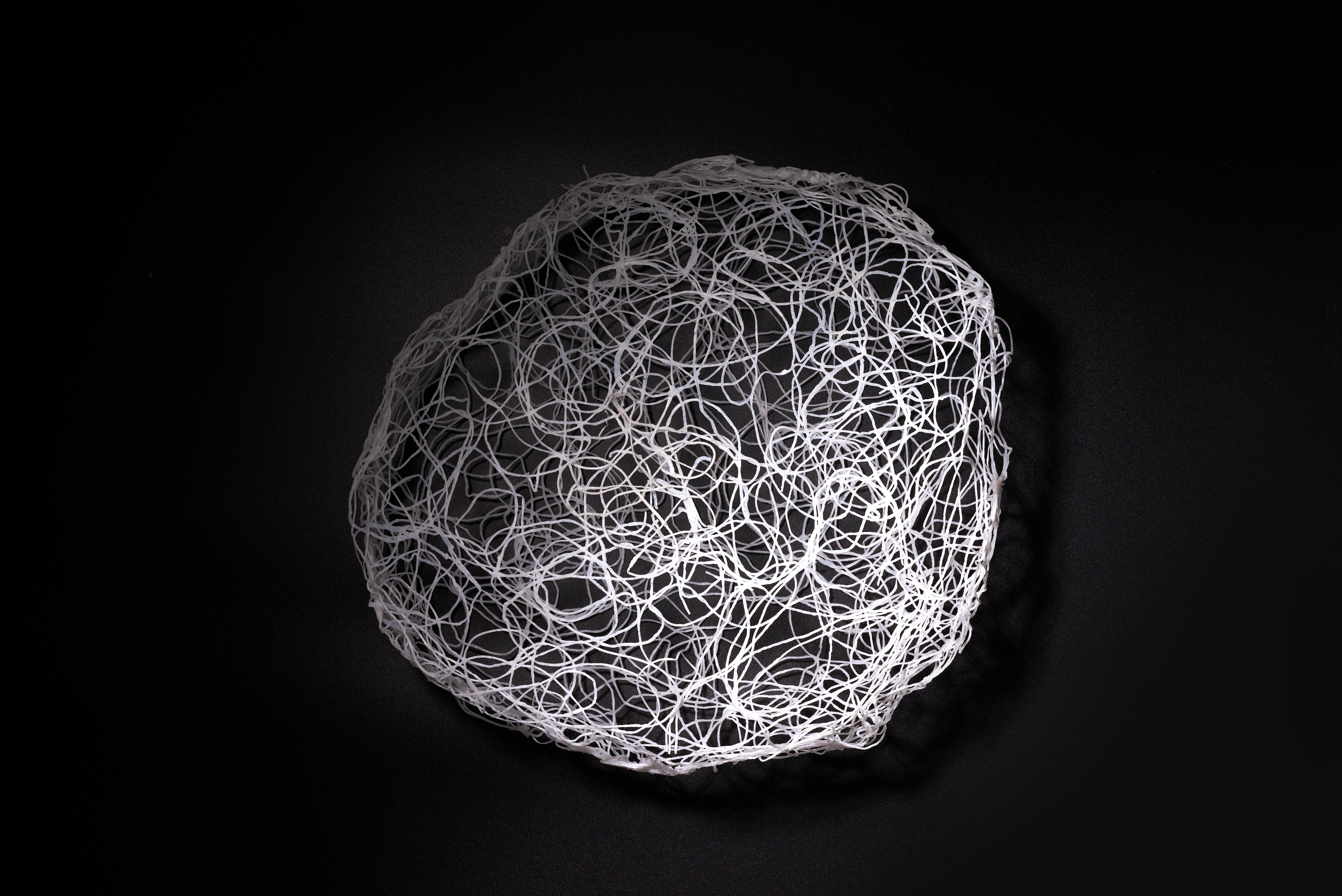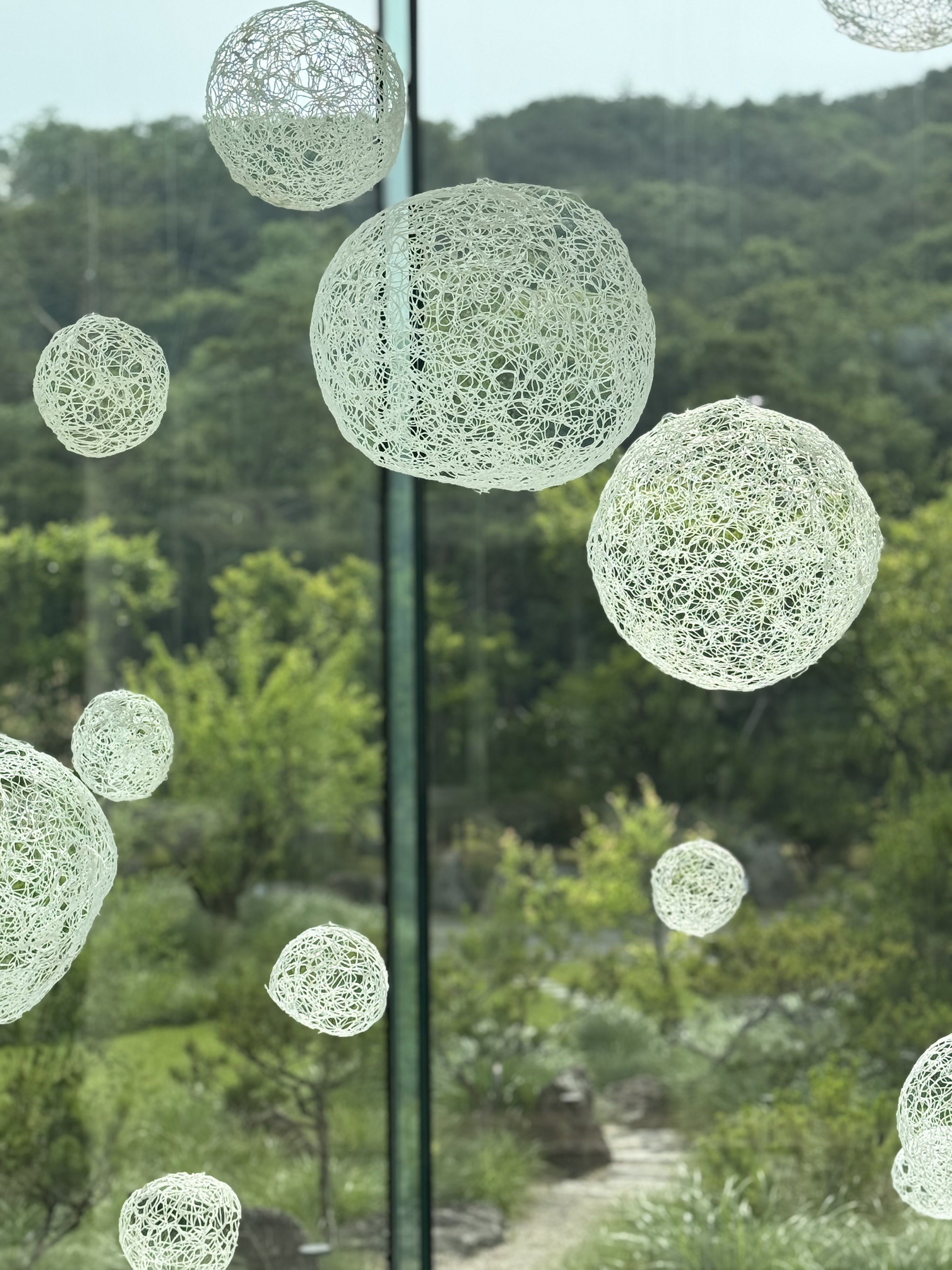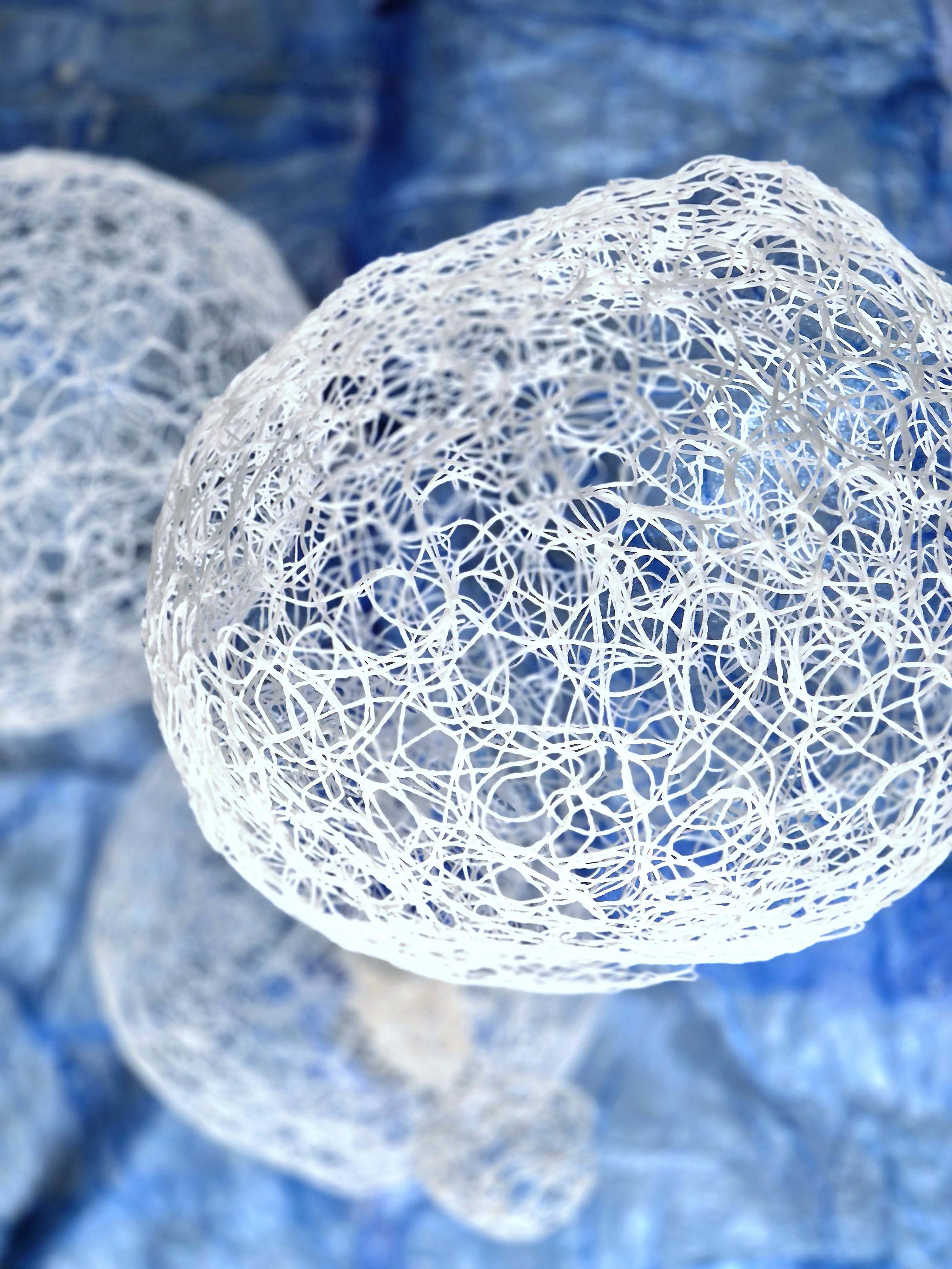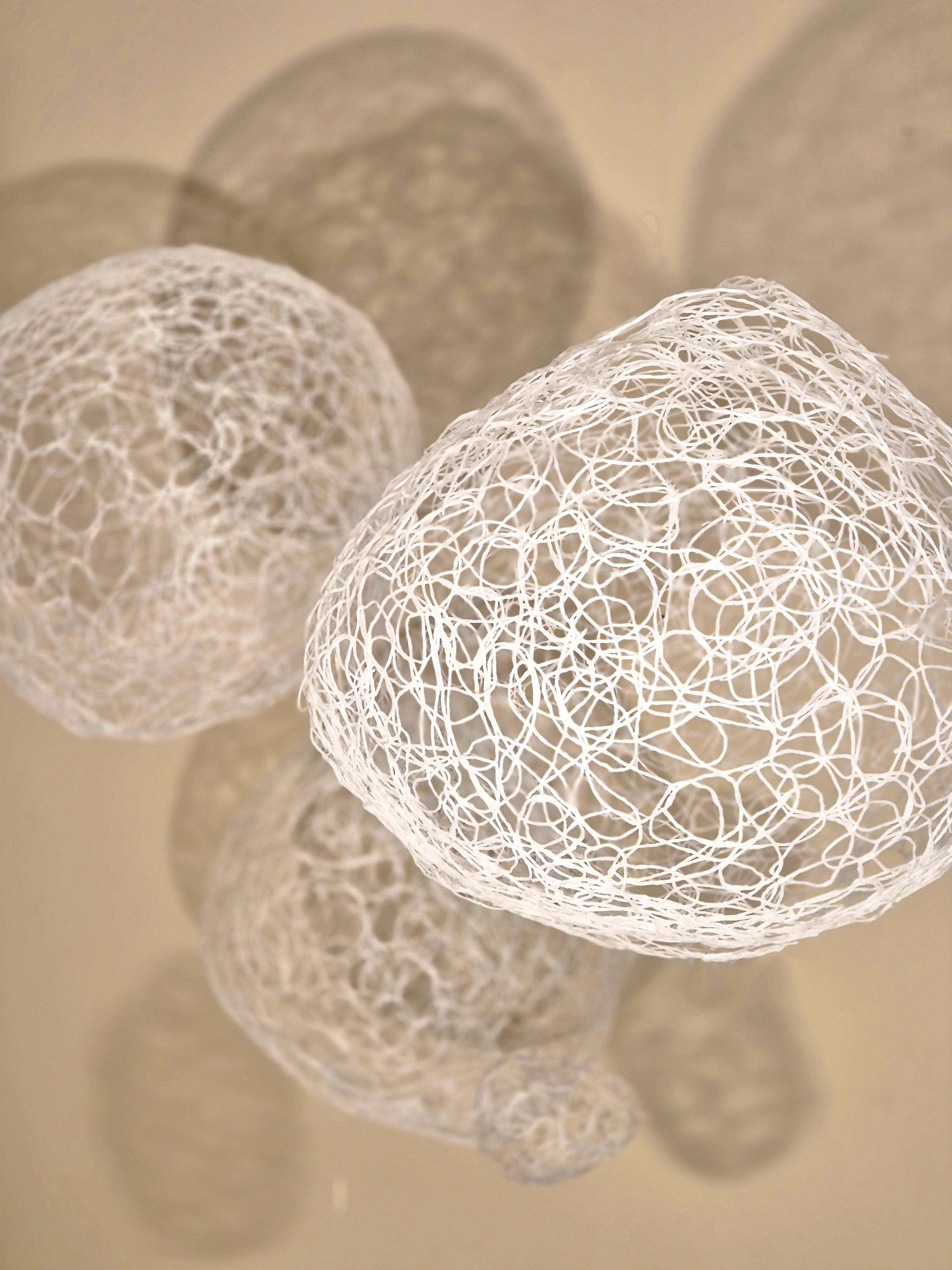 촘촘히 얽힌 흰색 플라스틱 실들이 유기적 구조로 엮여 구(球) 형태를 이루며, 빛이 있는 공간에 매달림으로써 실제 구름처럼 부유하는 듯한 시각적 효과를 만들어낸다. 인공과 자연, 무거움과 가벼움, 소비와 재생 사이의 경계를 은유적으로 탐색한다.