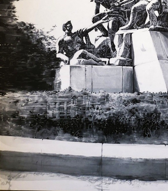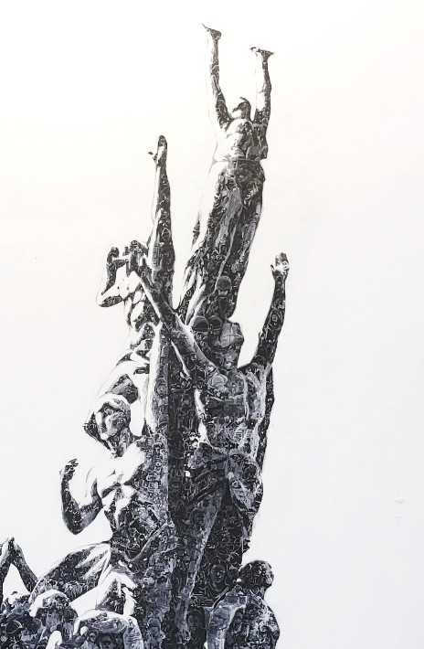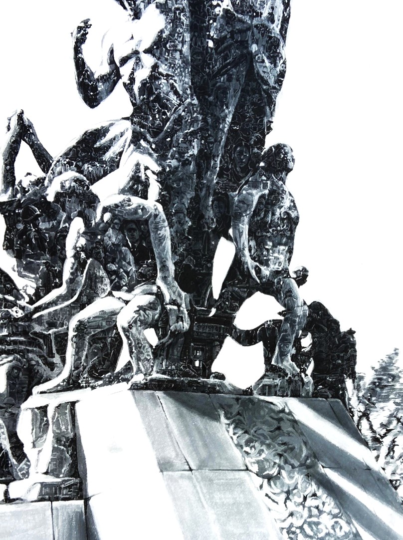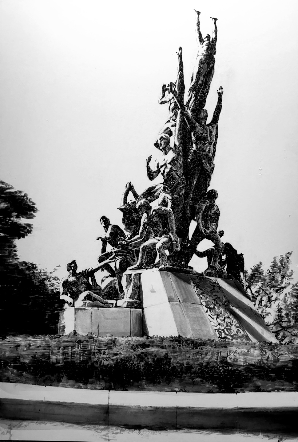 | 작품설명 | 이 기념비는 ‘충혼승천상’이라는 이름의 현재 현충원에 위치하는 동상이다. 국가를 위해 희생한 많은 영혼들이 한곳에 뭉쳐 있는 개체이다. 저 동상을 실물로 보고 사진을 찍었을 때 사진으로서는 담지 못하는 동상의 아우라가 너무 아쉽게 느껴졌다. 많은 사람들이 모여서 만들어낸 독립 대한민국을 하나의 사진으로 담기에는 부족하다 생각했다. 그래서 많은 사람들의 아우라로, 노력으로 이루어 낸 것을 담아내기 위해 이 작업을 시작했다. 모든 것의 시작은 어설프지만 노력과 과정들이 모여 응축된 과거들이 점점 번지고 커져서 현재를 변화시킨다. |