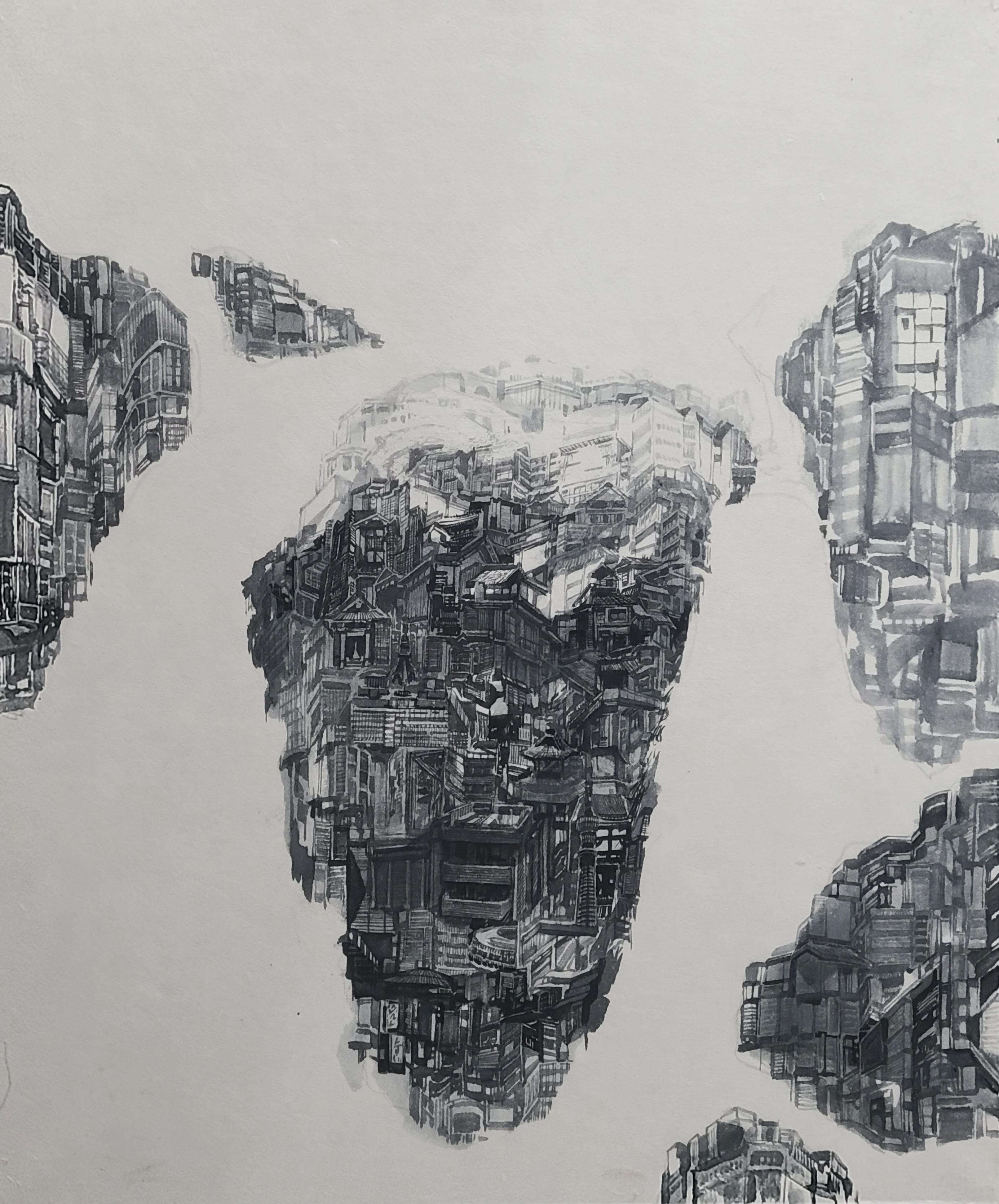 안녕하세요. 저는 저의 인생을 비유하여 자연에서부터 현재의 건축물이 마치 인간관계처럼 얽히고 설키며 만들어지기까지의 과정을 탐구합니다. 제 작업은 먹을 사용하여 작업을 주로하는데 먹을 찍으면 의도하지 않아도 계속 조금씩 번져나가는 모습이 마치 가만히 있을수 없듯이 계속 움직이는 영혼처럼 보여서 사용합니다.