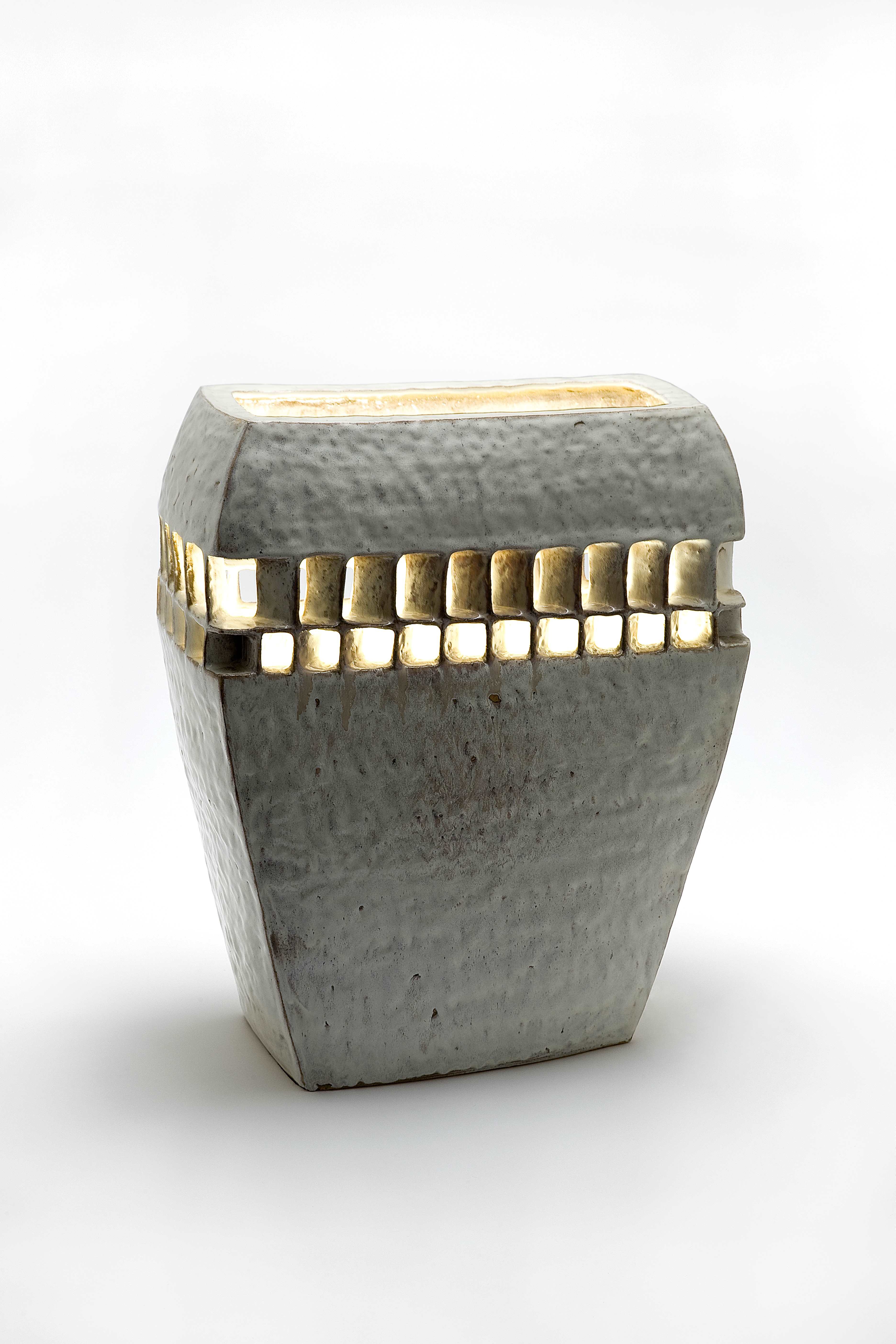 | 작품설명 | <빛의 형태-2> 건축물들의 가장 보편적인 구조가 되는 가로로 긴 직사 각형의 형태로 제작하였다. 내부의 광원은 4면의 형태를 두르는 수평 창 을 통해 외부로 이동한다. 2단으로 구성된 수평 창의 중간을 지나가는 가 로획은 낮은 면에서 높은 면으로 이동하며 패턴의 역동성을 만들어 준다. 환원 번조 과정을 통해 완성된 <빛의 형태-2>는 표면의 색감이 불규칙하 게 구성되어 흙이라는 매체의 자연스러움을 강조하였다. |