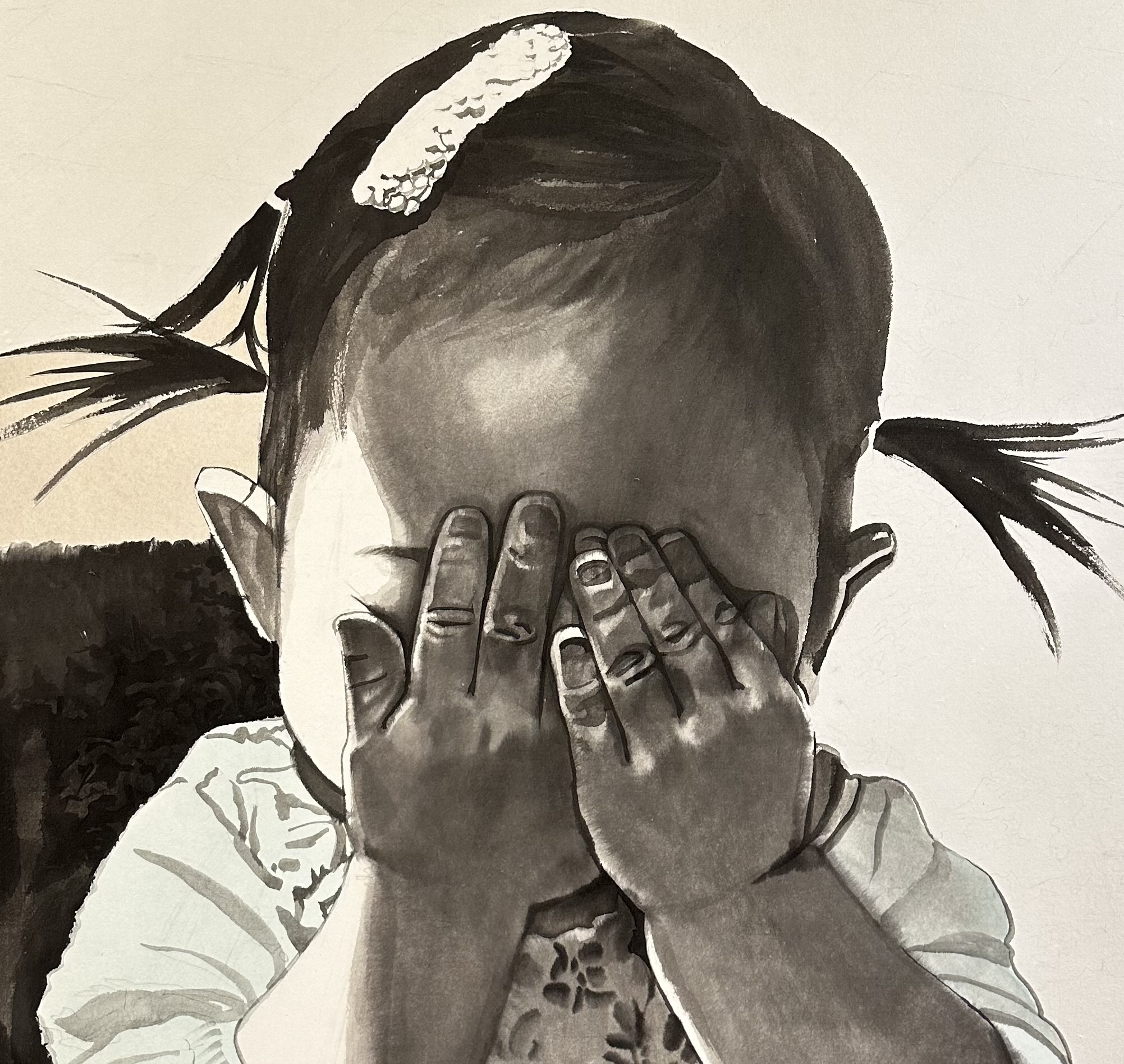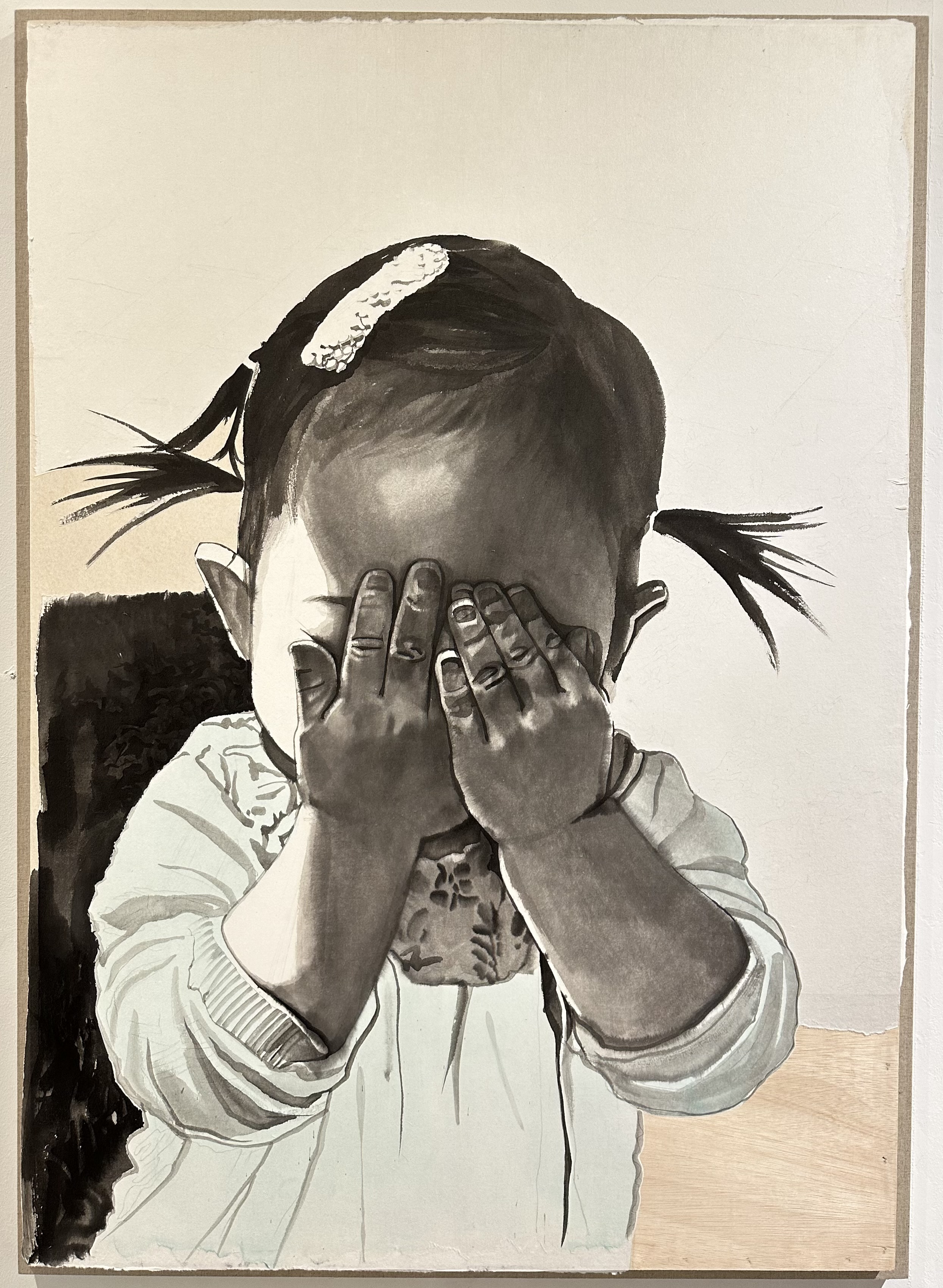2019년 우연히 길에서 마주쳤던 ‘주저앉아 우는 아이’가 한동안 뇌리에 박혔고, 그 이후로 아이를 ‘독립된 자아를 지닌 존재’로 인식해 표현하게 되었습니다. 이후 한지 위에 먹을 여러 번 선염하여 아이의 격분한 감정을 마치 아토피가 걸린 듯한 피부로 표현하거나, 아이가 귀·입·눈을 막는 형상들을 통해 순수와 위장의 양가성을 탐구해 왔습니다.