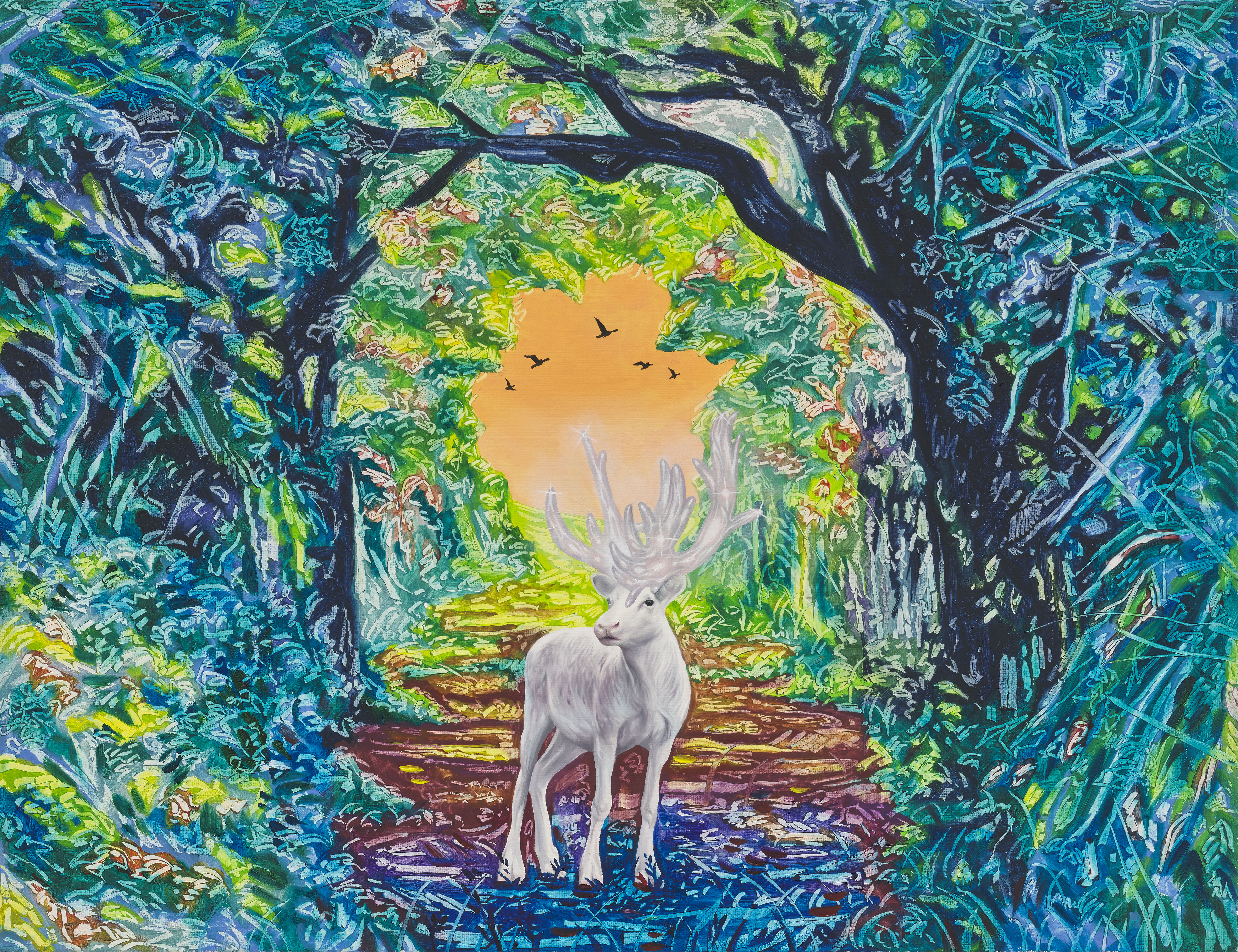 작품설명 | 이 작품은 안식과 불안이 공존하는 가상의 시공간을 통해 현실 너머의 이상을 투영하여 보여주는 작업이다. 화면 속 사슴은 순수함, 강인함, 평화 등을 상징하는 존재로, 인류가 꿈꾸는 이상적이고 신성한 생물이다. 그러나 나의 작업에서는 다소 과장되고 장식적인 모습을 통해 디지털 시대의 모순된 욕망과 이질적 감각을 담아낸다. 또한, 그러한 존재를 몽환적으로 표현된 자연의 길목에 두어 안과 밖의 경계를 만들어낸다. 그렇게 나는 현실과 가상의 모호한 경계에서 비롯된 이상향, 그 이면에 존재하는 불안과 긴장을 평면 회화로 풀어낸다. |
