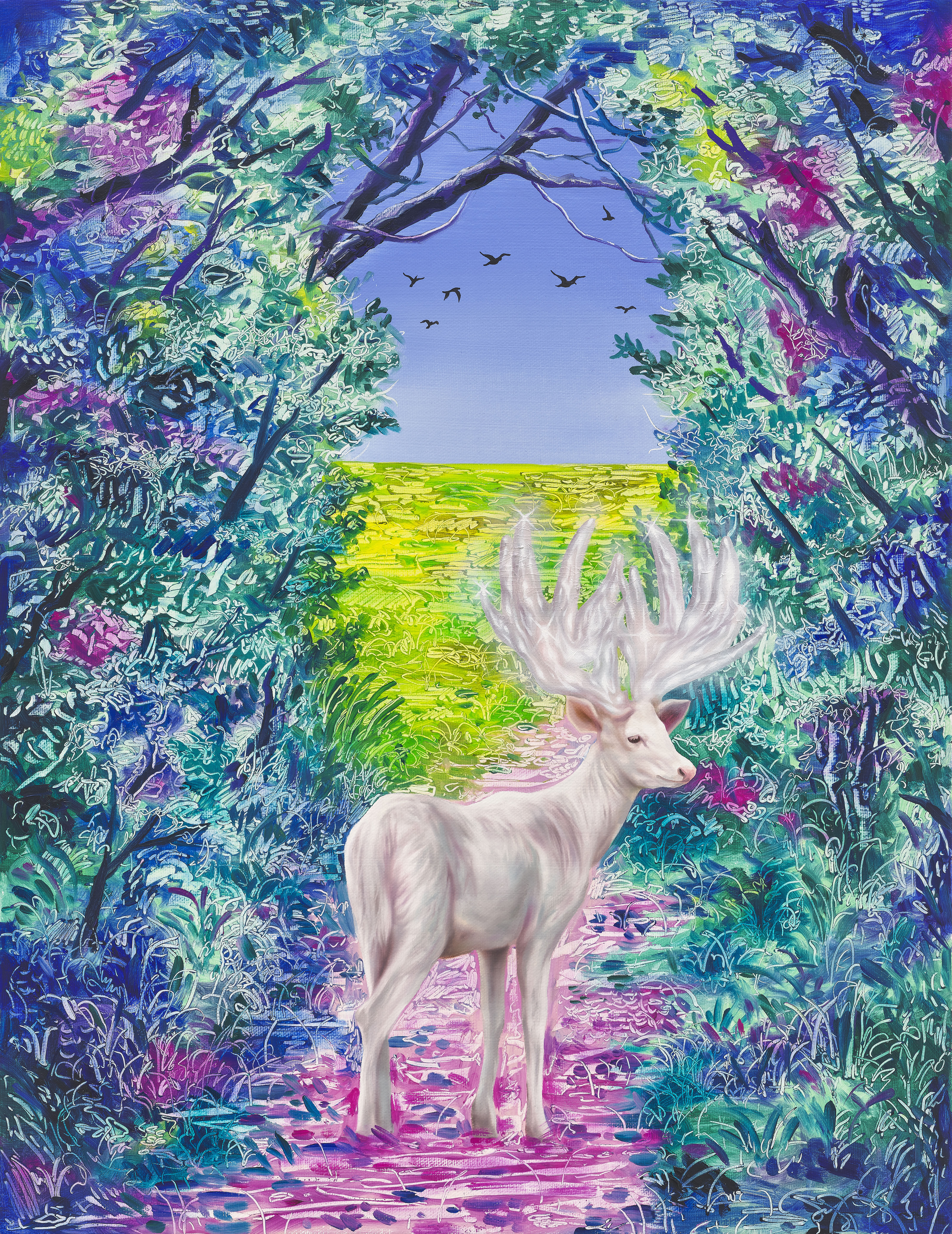 작품설명 | 이 작품은 안식과 불안이 공존하는 가상의 시공간을 통해 현실 너머의 이상을 투영하여 보여주는 작업이다. 화면 속 사슴은 순수함, 강인함, 평화 등을 상징하는 존재로, 인류가 꿈꾸는 이상적이고 신성한 생물이다. 그러나 나의 작업에서는 다소 과장되고 장식적인 모습을 통해 디지털 시대의 모순된 욕망과 이질적 감각을 담아낸다. 또한, 그러한 존재를 몽환적으로 표현된 자연의 길목에 두어 안과 밖의 경계를 만들어낸다. 그렇게 나는 현실과 가상의 모호한 경계에서 비롯된 이상향, 그 이면에 존재하는 불안과 긴장을 평면 회화로 풀어낸다. |