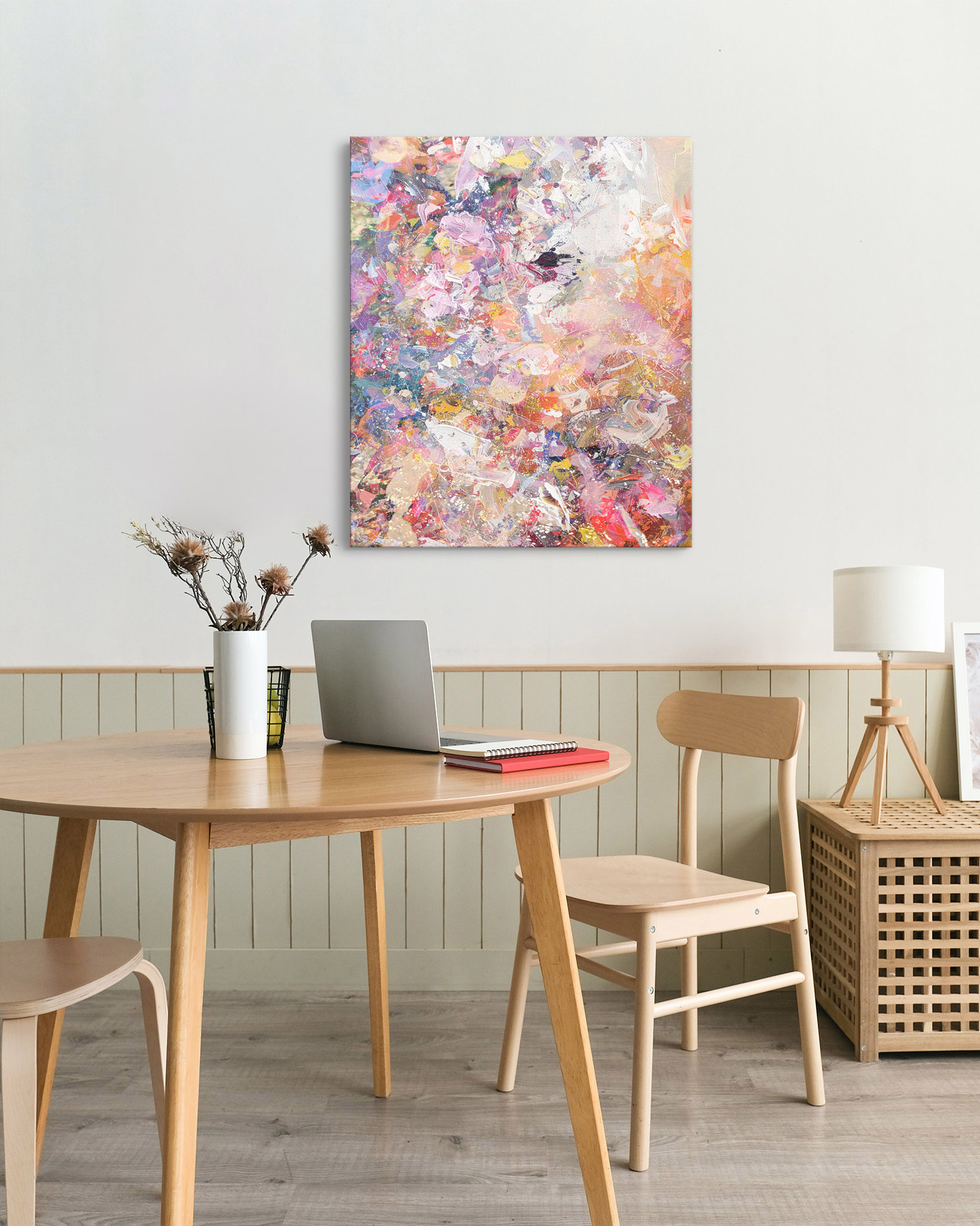 이 비물질적인 작업은 스크린 속에서 완성되는 것이 아니라, 캔버스라는 물리적인 실체로 ‘전환(translation)’되는 과정을 통해 최종적으로 마무리됩니다. 디지털에서 태어난 이미지가 안료 잉크의 형태로 물리적인 캔버스 천의 질감 위로 스며드는 순간, 차가운 데이터는 따뜻한 감각의 대상으로 다시 태어납니다.