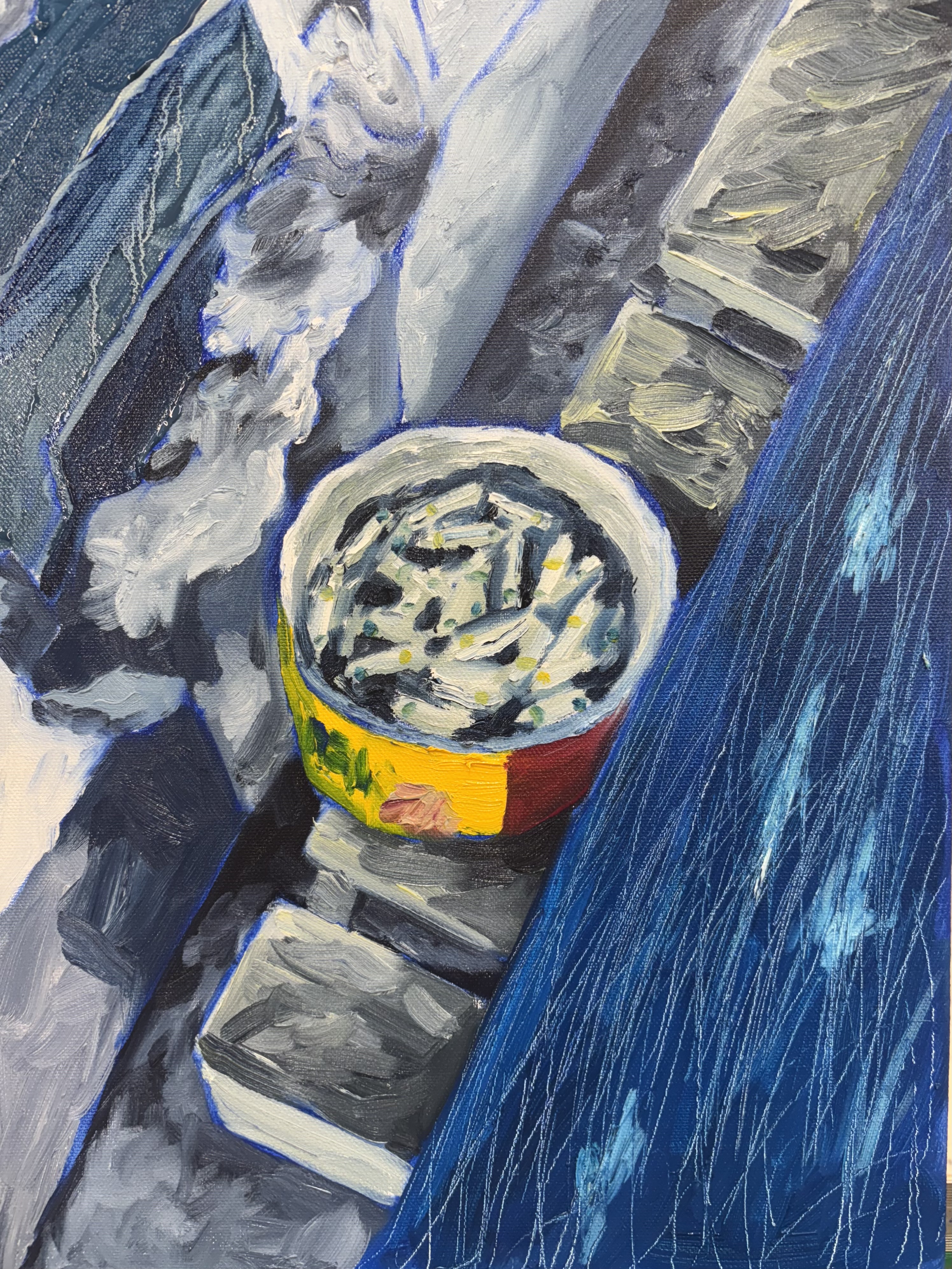 | 작품설명 | 「남겨진 흔적」은 길가에 놓인 작은 통과 그 안에 쌓여 있는 담배꽁초들을 담은 작품이다. 작가는 무심히 버려진 사물들을 단순한 폐기물이 아닌, 인간의 흔적과 시간의 잔여물로 바라본다. 화면을 가득 채운 차가운 청색과 회색의 붓질은 도시의 공기와 바닥의 차가움을 전하며, 작은 원형의 담배통은 그 속에서 반복된 행위와 축적된 시간을 드러낸다. 강렬한 노란색과 붉은색의 대비는 화면 속에서 하나의 시각적 중심을 이루며, 무채색의 주변과 충돌해 잔혹하면서도 생생한 인상을 남긴다. 이 작품은 ‘사소한 것들’에 대한 집요한 관찰을 통해, 우리가 쉽게 지나쳐 버리는 일상의 파편들이 품고 있는 이야기와 감정을 되묻는다. |
