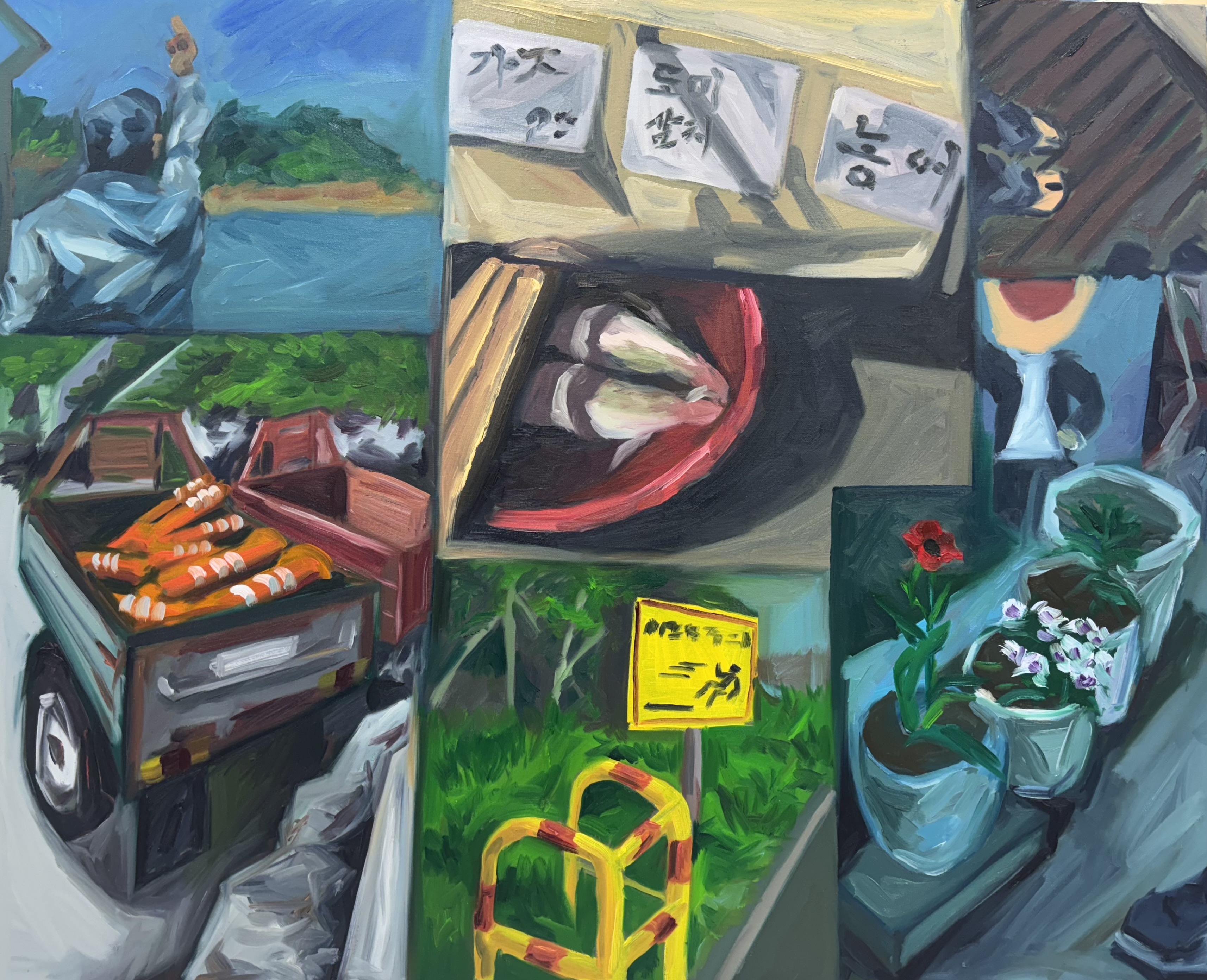 | 작품설명 | 이 작품은 무의도의 일상적인 장면들을 단편적으로 수집하고 조합한 연작의 일부로, 섬 곳곳에서 발견한 세밀한 풍경들 속에 작가의 시선을 담았다. 작은 화분, 표지판, 트럭 위의 고깔, 손을 든 사람의 뒷모습 등은 일견 평범하지만 배열된 방식 속에서 묘한 긴장감과 감정을 불러일으킨다. 사소하고 흩어진 장면들이 하나의 화면에 공존하면서, 섬이 가진 느슨한 시간성과 그 안에 존재하는 사람들의 흔적이 기록된다. 이는 단순한 풍경의 재현이 아니라, 작가가 마주한 섬의 정서와 이질감을 은유적으로 풀어낸 시도이기도 하다. |