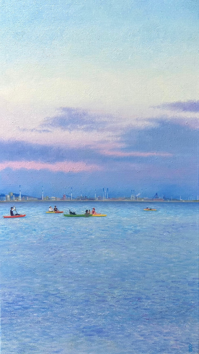 | 작품설명 | 넓게 펼쳐진 바다. 수평선 너머로 작은 건물들이 희미하게 모습을 드러내고, 고무보트를 타고 있는 사람들의 모습이 떠 있다. 전체적으로 푸른빛이 화면을 감싸고 있지만, 그 안엔 왠지 모를 따뜻함이 배어 있다. 차가운 색 속에서도 잔잔하게 온기를 전해준다. 이 풍경은 멀고도 가까운 감정의 거리감을 담고 있다. 닿을 수 없는 장면처럼 보이지만, 우리 모두 언젠가 바라보았을 법한 익숙한 풍경처럼 다가온다. |