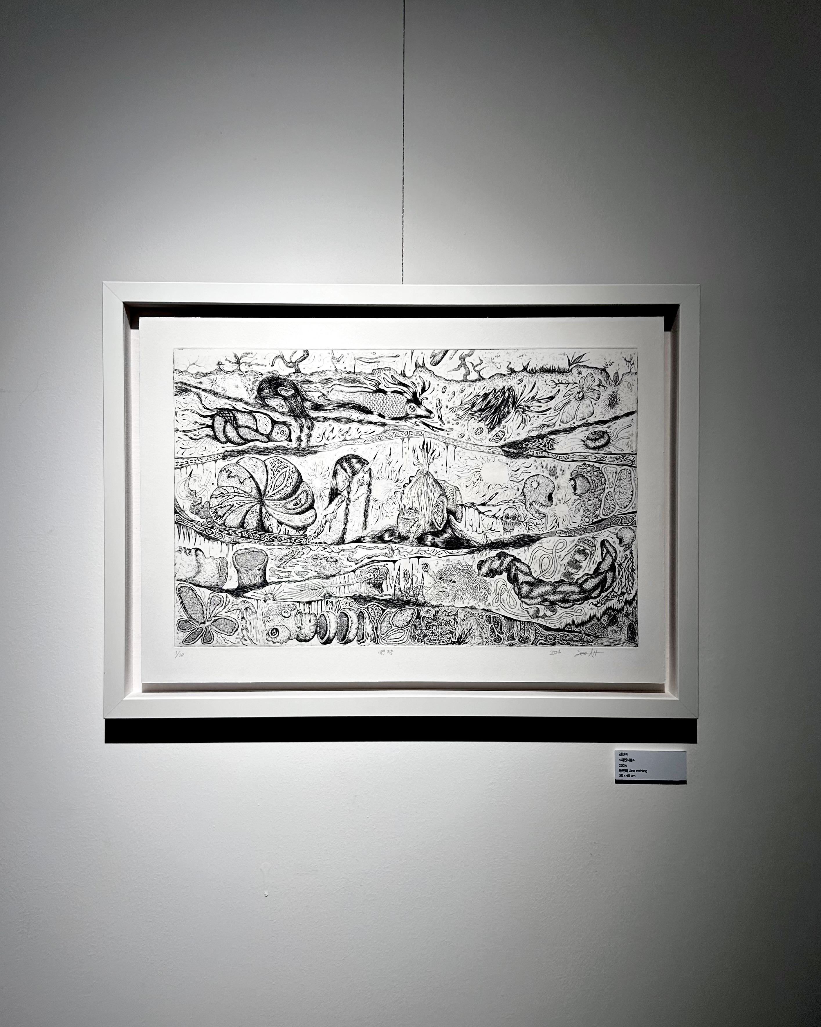 동판화 특유의 반복적인 선과 밀도 높은 묘사는 감정이 축적되는 과정을 물리적으로 체감하게 한다. 판을 긁고 부식시키는 과정은 내면을 파고드는 행위이자, 감정을 꺼내어 층위로 정리하는 과정이다. 나는 이 작업을 통해 나 자신을 분석하거나 치유하기보다 감정이 쌓여 존재하는 방식 자체를 관찰하고자 했다. 이 작품은 결국 나의 내면을 이루는 구조에 대한 기록이자 보이지 않는 감정이 어떻게 형태를 얻고 시간 속에 남는지를 보여주는 하나의 지질도이다.