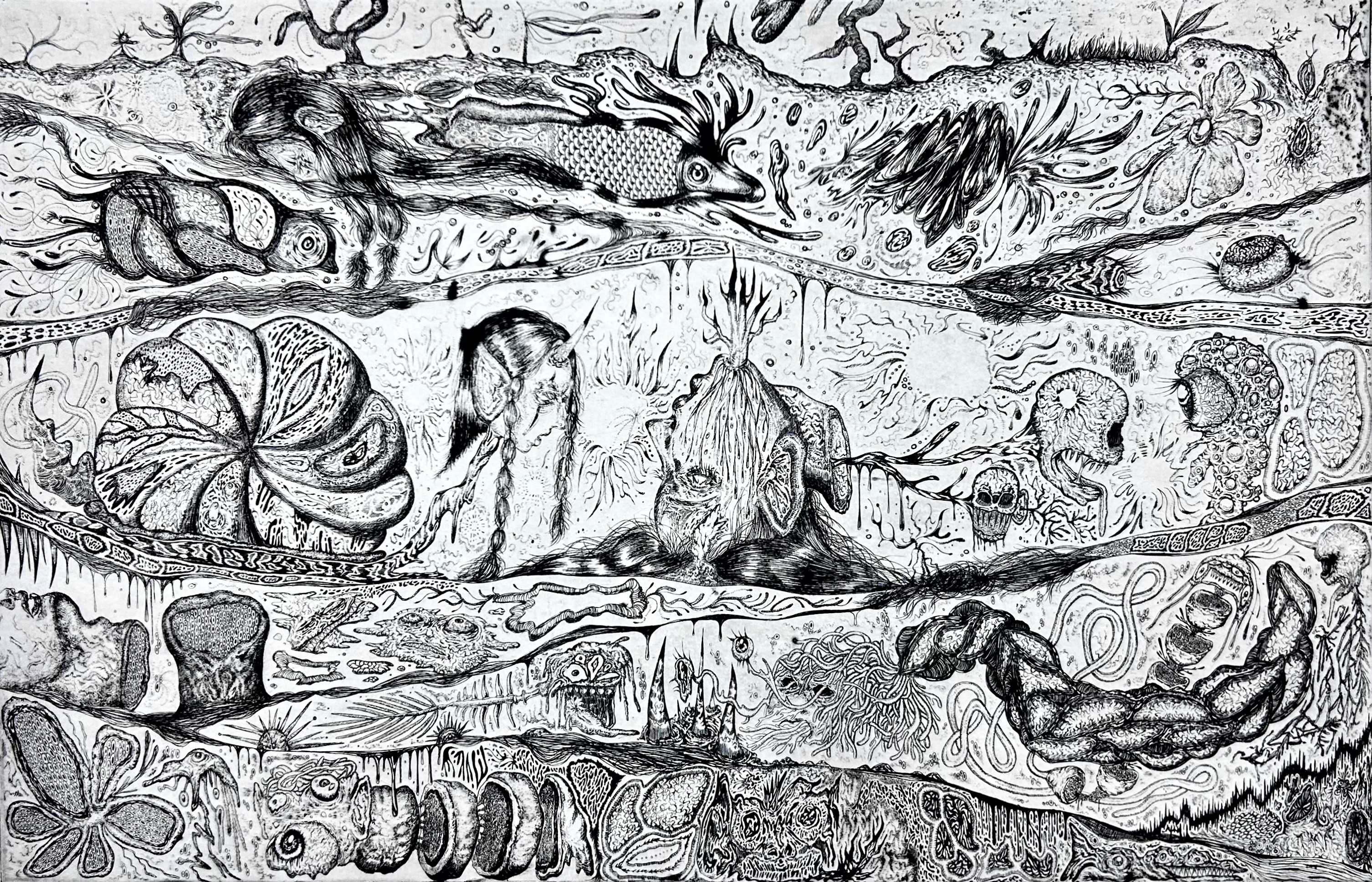 라인에칭 기법을 통해 차가운 현실과 누적된 감정을 비정형적이고 기괴한 인간과 사물의 경계를 넘나드는 왜곡된 형상으로 표현합니다.